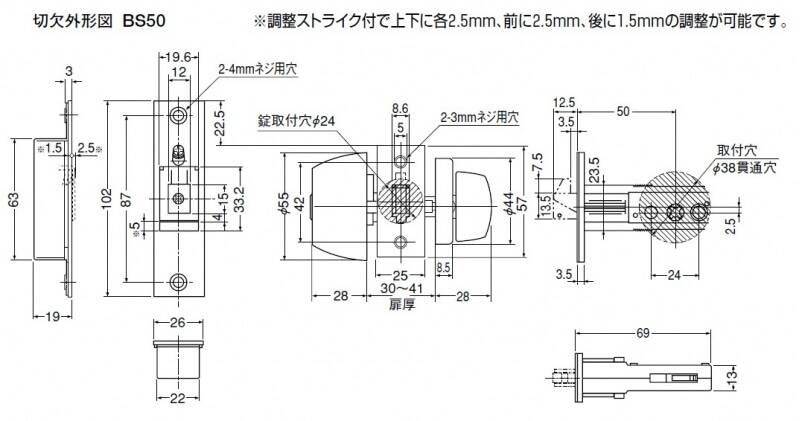 チューブラ鎌錠 バックセット50mm〈引戸用〉 玄関錠(シリンダー錠付5本ピン・キー3本付)
