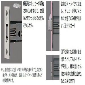 錠前がストライクに接触し、トリガーが押さえられた状態でのみ鎌が出ます(。逆トリガー)