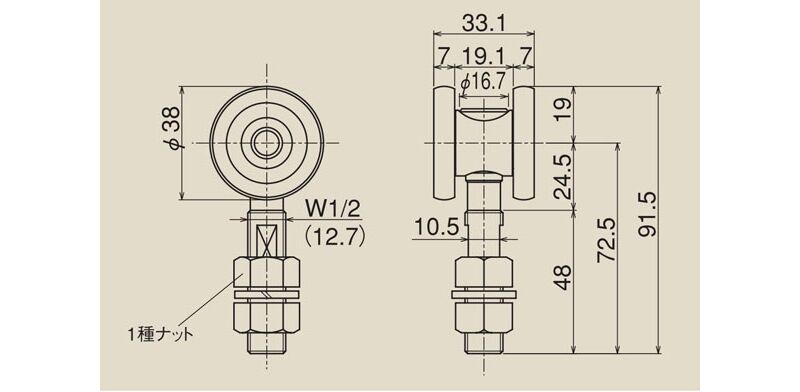 カーブレール用の吊車です。扉の直線移動用としては複車をお使いください。