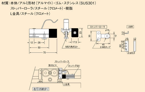 本体/アルミ形材(アルマイト)・ゴム/ステンレス(SUS301)、ストッパーローラ/スチール(クロメート)・樹脂、L金具/スチール(クロメート)