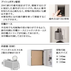 受取可能な最大サイズ(H×W×D):540×370×330(宅配ボックスで受取・取出ができる最大寸法です。最大サイズを超える荷物の受取はできません。目安寸法につき、梱包の状態によっては受け取れない場合もあります。