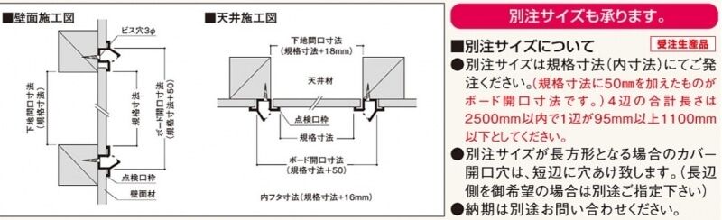 天井・壁点検口枠 別注サイズ規格(ボード厚9.5mm用)