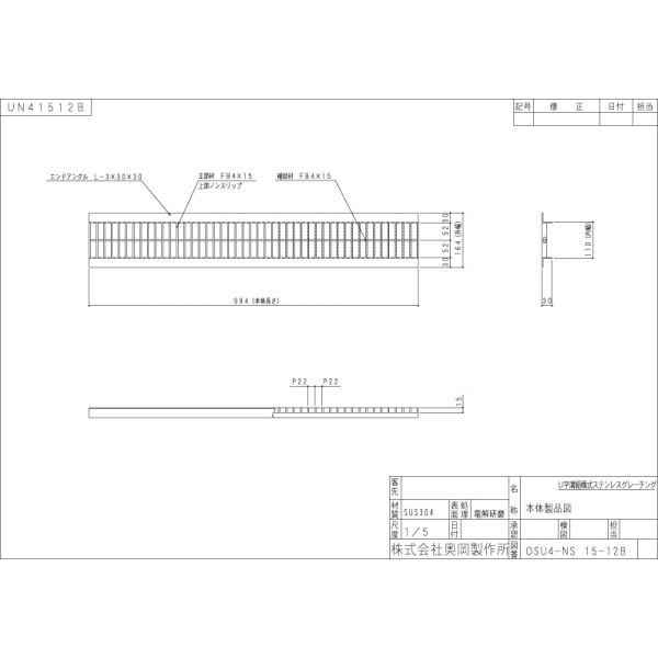【奥岡製作所(オーケーグレーチング)】 OSU4-NS 15-12B ステンレス製 U字溝用グレーチング 中間目プレーンタイプ 溝幅120用 T-14【取寄品】