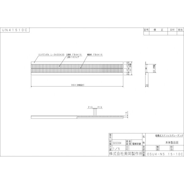 【奥岡製作所(オーケーグレーチング)】 OSU4-NS 15-10C ステンレス製 U字溝用グレーチング 細目プレーンタイプ 溝幅100用 T-14【取寄品】