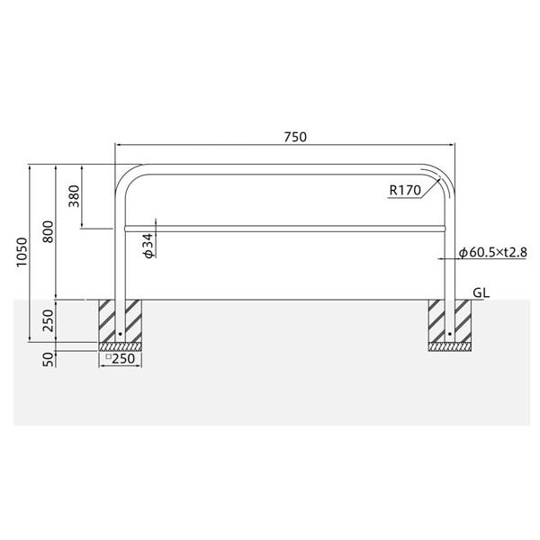 バリカー横型 車止め スタンダード スチールハイショルダータイプ φ60.5 W750 横桟付き