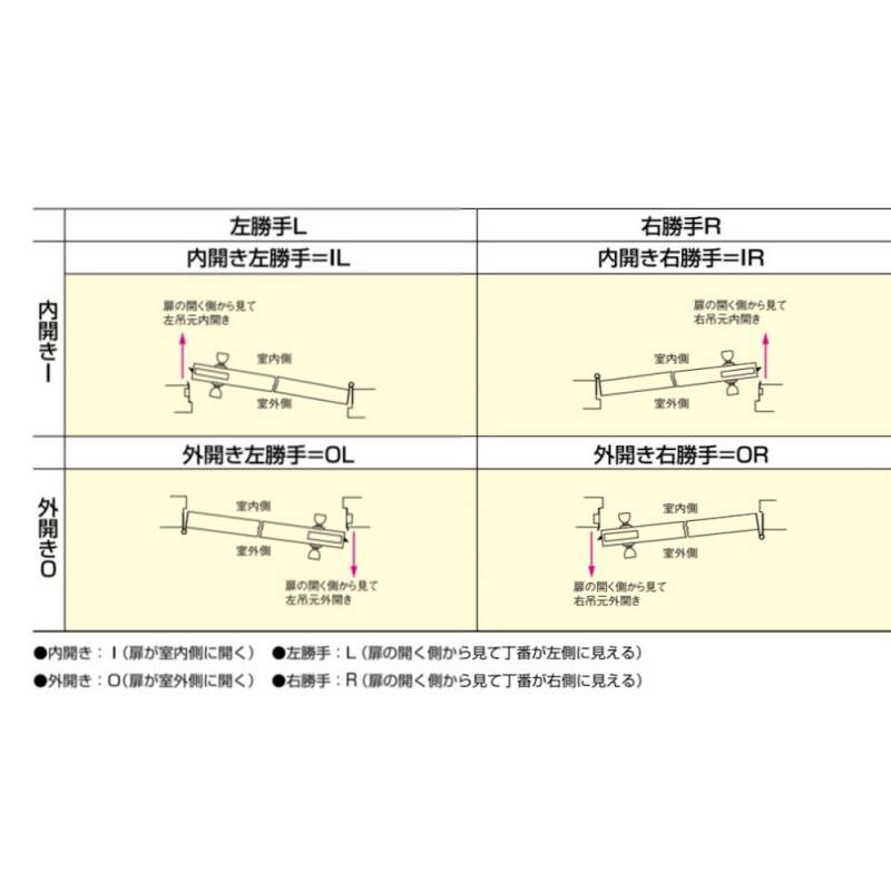 この商品は外開き(扉が室外側に開く)右勝手となります。(扉の開く側から見て丁番が右側に見える)
